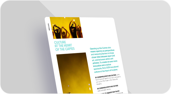 4 02 PARIS 2 CULTURE AT THE HEART OF THE GAMES Opening up the Games also means opening up perspectives and removing barriers to forge closer links between sport and art, and between artists and athletes. To create an even more innovative and creative spectacle, Paris 2024 has placed culture at the heart of its plans: BY COMBINING SPORT AND CULTURE, at the foot of some of France’s most iconic monuments, such as the Ei昀昀el Tower or the Château de Versailles. BY COMBINING SPORT AND CULTURE at all celebration venues. BY AIMING TO UNEARTH NEW TALENT throughout the Cultural Olympiad and then the Olympic Festival, with a special focus on young generations of artists, emerging trends and countertrends. BY WELCOMING CULTURES FROM AROUND THE WORLD, promoting diversity and the mixing of cultures. The Cultural Olympiad has been organised in collaboration with the Ministry of Culture and its associated institutions, and all the stakeholders involved in bringing Paris 2024 S to life. It began with the last breath of the Tokyo E M Games. Cultural events took place as part of A N G Paris' 20th annual "Nuit Blanche" celebrations. E Flagship institutions like the Théâtre National P 4 O de la Danse and the Musée du Quai Branly have 2 0 also contributed. The whole cultural ecosystem S 2 I will be working overtime throughout the 昀椀rst R A P half of 2022. 10 © Cameron Spencer/Getty Images