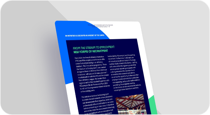 The Legacy and Sustainability plan for the Paris 2024 Olympic and Paralympic Games — 59 AN INITIATIVE ACCELERATED AS A RESULT OF THE GAMES FROM THE STADIUM TO EMPLOYMENT: NEW FORMS OF RECRUITMENT Paris 2024, the French Athletics Federation bodies (led by Pôle emploi) and the sporting (FFA) and Pôle emploi joined forces to offer movement. Furthermore, it will make use a new form of job dating in an athletics of innovative recruitment tools to fill a large stadium. This innovative programme, “From number of jobs linked to the Games – starting the Stadium to Employment”, was created with roles within the organising committee at regional level in 2019 but Paris 2024 took and at partner marketing companies with 16 it national, with around 50 dates planned . a strong interest in the capacity of such In collaboration with the FFA and the Greater an event to draw unusual applications, Paris Athletics League, the Greater Paris as well as the opportunity to showcase their regional authorities decided to partner with employer brand and make their professions Pôle emploi Île-de-France and Paris 2024 more appealing. Lastly, public health conditions to roll out 13 programme-related initiatives permitting, the companies working in the coming years. on the Games can also recruit in the stadiums, including in Seine-Saint-Denis and Paris. The initiative involves harnessing sport to create shared moments where jobseekers can demonstrate their expertise, social and professional skills and attitudes to recruiters before embarking on interviews. It therefore aims to facilitate the recruitment of the long term unemployed with an innovative tool that focuses on highlighting applicants’ interpersonal skills. Its effectiveness has already been proven, with 50% of participants back in work or enrolled in training programmes leading to qualifications. On average, around 40% of attendees at classic job dating events achieve positive outcomes. Building on the results of its initial trials, this type of initiative – with sport revealing job applicants’ skills – will be deployed throughout France. It could receive financial support from the Paris 2024 endowment fund and be promoted among public employment © – CASSE Simon 16. Due to the hygiene measures applied throughout 2020, the organisers had to postpone around 40 of those dates to 2021.