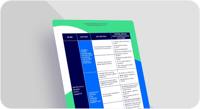 TThhe Le Leeggaaccy ay annd Sd Suussttaaiinnaabbiilliitty py pllaan fn foor tr thhe Pe Paarriis 2s 200224 4 OOllyymmppiic ac annd Pd Paarraallyymmppiic Gc Gaammees s — 8— 800 INITIATIVES LAUNCHED PILLARS OBJECTIVES SUB-OBJECTIVES OR ACCELERATED AS A RESULT OF THE GAMES 1. Daily 30-minute period of exercise at school Promote physical activity and sport, 2. Transformation of lessons ENCOURAGE in particular for 6- to 11-year-olds at school* CHILDREN 3. The Generation 2024 label TO BECOME MORE 4. The Olympic and Paralympic Week PHYSICALLY ACTIVE 5. Development of the Carte AND INVOLVED Passerelle IN SPORT, FROM 6. The university project Dancing PRE-SCHOOL to 2024* TO POST-GRAD Enhance the interconnections 7. Unis’vers USEP 2024 sports between education and sport competition* 8. En route to the Gymnasiades Normandie 2022* Encourage the use of sport and 9. The Generation 2024 platform the values it champions to educate young people 10. The Education through Sport call for proposals Harness sport to support children 11. The Games kit for school Sport to improve struggling at school and encourage children* education them to stay in education and civic 12. 1,000 work experience placements engagement CHAMPION SPORT to learn about the Olympic and TO CHANNEL Paralympic Games A LOVE Promote Olympic and Paralympic 13. The Education in Movement OF LEARNING sports and values programme AND FOSTER 14. The learning kit based on the COMMUNITY SPIRIT film Race* 15. Programmes to teach the Olympic and Paralympic values: I’mPOSSIBLE 16. The Paris vs Seine-Saint-Denis and Terres d’Envol USEP Games* Introduce Generation 2024 17. School Sports Days (SSD)* to the Games 18. Regional deployment of the University Olympic Session project* Universitaire* Increase the role of sport in civic 19. Generation 2024 civic service USE SPORT engagement programmes 20. The Universal National Service TO DRIVE to promote sport and its values ENGAGEMENT 21. The Leaders of Tomorrow AND CITIZENSHIP Boost civic engagement programme in the sporting movement * Initiatives expanded upon in the “Generation 2024: educational programme of the Paris 2024 Olympic and Paralympic Games” report