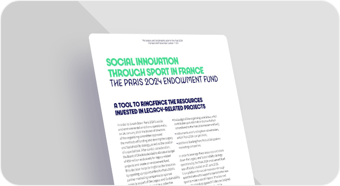 The Legacy and Sustainability plan for the Paris 2024 Olympic and Paralympic Games — 107 SOCIAL INNOVATION THROUGH SPORT IN FRANCE THE PARIS 2024 ENDOWMENT FUND A TOOL TO RINGFENCE THE RESOURCES INVESTED IN LEGACY-RELATED PROJECTS In order to break down Paris 2024’s social • the budget of the organising committee, which and environmental ambitions operationally, contributes up to €50 million (some of which on 24 January 2019 the Board of Directors is transferred to the Paris 2024 endowment fund); of the organising committee approved • instruments and funding from stakeholders, the methods of funding and steering the Legacy which Paris 2024 can promote; and Sustainability strategy, as well as the creation • additional funding from Paris 2024’s partner of a special tool. After careful consideration, marketing companies. the Board of Directors decided to allocate a budget of €50 million exclusively for legacy-related In order to leverage these resources and break projects and create an endowment fund. down the Legacy and Sustainability strategy This decision helps to ringfence the resources operationally, the Paris 2024 endowment fund by opening up opportunities for Paris 2024’s was officially created on 27 June 2019. partner marketing companies to sponsor It is a platform for social innovation through projects as part of the Legacy and Sustainability sport that sets out to support projects that harness strategy, as well as formalise a collective sport to make a social impact. This tool and governance that closely binds the members the methodological approach it takes are designed of the Paris 2024 Board of Directors. to be passed on as a legacy after 2024. The budget allocated to legacy and sustainability The future of the endowment fund will be projects can therefore come from three sources: outlined in 2022.