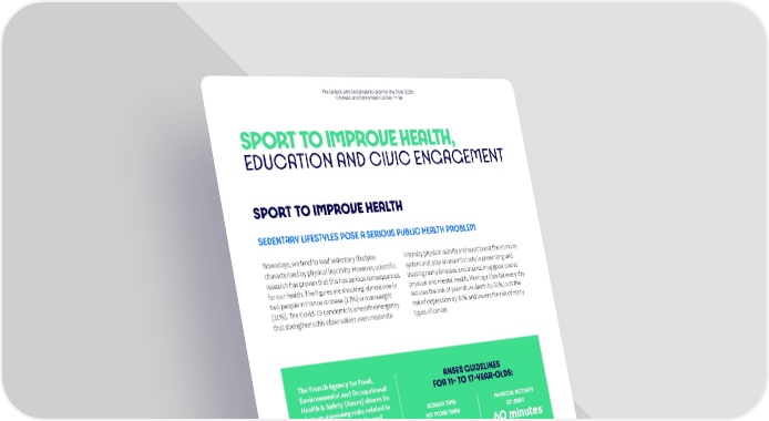 The Legacy and Sustainability plan for the Paris 2024 Olympic and Paralympic Games — 66 SPORT TO IMPROVE HEALTH, EDUCATION AND CIVIC ENGAGEMENT SPORT TO IMPROVE HEALTH SEDENTARY LIFESTYLES POSE A SERIOUS PUBLIC HEALTH PROBLEM Nowadays, we tend to lead sedentary lifestyles intensity physical activity and sport boost the immune characterised by physical inactivity. However, scientific system and play an essential role in preventing and research has proven that this has serious consequences treating many illnesses and maintaining good overall for our health. The figures are shocking: almost one in physical and mental health. Moving a little bit every day two people in France is obese (17%) or overweight reduces the risk of premature death by 30%, cuts the (31%). The Covid-19 pandemic is a health emergency risk of depression by 30% and lowers the risk of many that strengthens this observation: even moderate- types of cancer. The French Agency for Food, ANSES GUIDELINES Environmental and Occupational FOR 11- TO 17-YEAR-OLDS: Health & Safety (Anses) shares its view on assessing risks related to SCREEN TIME PHYSICAL ACTIVITY levels of physical activity and NO MORE THAN AT LEAST sedentary behaviour among children and teenagers 2 hours 60 minutes a day a day The Anses study published in September 2020 aims to estimate the proportion of children and teenagers whose sedentary 66% behaviour or low levels of physical activity could present risks to their do not achieve health. It recommends that 6- to the Anses guidelines, 17-year-olds have no more than two putting their health hours of leisure screen time a day at risk and engage in at least 60 minutes of moderate- to vigorous-intensity physical activity a day. 17% 11- TO 17- are particularly at risk YEAR-OLDS (less than 20 minutes of physical activity, coupled with over 4.5 hours of screen time a day)
