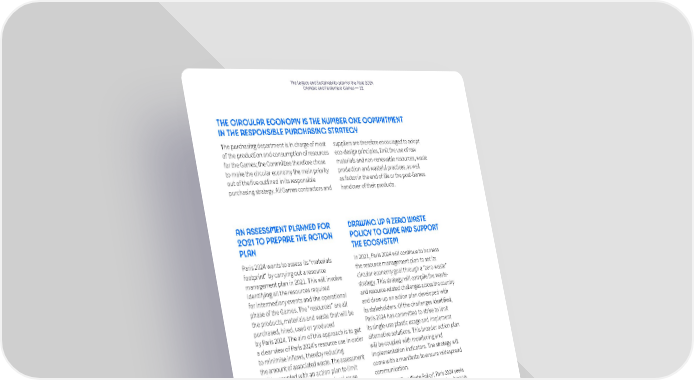 The Legacy and Sustainability plan for the Paris 2024 Olympic and Paralympic Games — 22 THE CIRCULAR ECONOMY IS THE NUMBER ONE COMMITMENT IN THE RESPONSIBLE PURCHASING STRATEGY The purchasing department is in charge of most suppliers are therefore encouraged to adopt of the production and consumption of resources eco-design principles, limit the use of raw for the Games; the Committee therefore chose materials and non-renewable resources, waste to make the circular economy the main priority production and wasteful practices, as well out of the five outlined in its responsible as factor in the end of life or the post-Games purchasing strategy. All Games contractors and handover of their products. AN ASSESSMENT PLANNED FOR DRAWING UP A ZERO WASTE 2021 TO PREPARE THE ACTION POLICY TO GUIDE AND SUPPORT PLAN THE ECOSYSTEM Paris 2024 wants to assess its “materials In 2021, Paris 2024 will continue to harness footprint” by carrying out a resource the resource management plan to set its management plan in 2021. This will involve circular economy goal through a “zero waste” identifying all the resources required strategy. This strategy will compile the waste- for intermediary events and the operational and resource-related challenges across the country phase of the Games. The “resources” are all and draw up an action plan developed with the products, materials and waste that will be its stakeholders. Of the challenges identified, purchased, hired, used or produced Paris 2024 has committed to strive to limit by Paris 2024. The aim of this approach is to get its single-use plastic usage and implement a clear view of Paris 2024’s resource use in order alternative solutions. This broader action plan to minimise inflows, thereby reducing will be coupled with monitoring and the amount of associated waste. The assessment implementation indicators. The strategy will will be coupled with an action plan to limit come with a manifesto to ensure widespread the amount of waste, structure local reuse communication. channels accordingly and anticipate Through its “Zero Waste Policy”, Paris 2024 seeks the processing and recovery of residual waste. to do more than merely set an example – it wants to sustainably transform channels for a more circular and inclusive economy.