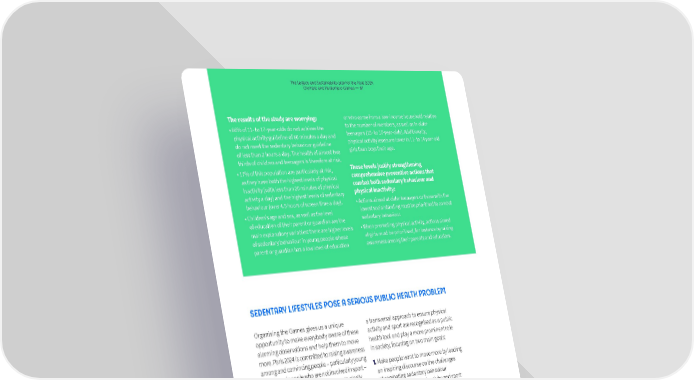 TThhe Le Leeggaaccy ay annd Sd Suussttaaiinnaabbiilliitty py pllaan fn foor tr thhe Pe Paarriis 2s 200224 4 OOllyymmppiic ac annd Pd Paarraallyymmppiic Gc Gaammees s —— 67 67 The results of the study are worrying: or who come from a low-income household relative • 66% of 11- to 17-year-olds do not achieve the to the number of members, as well as in older physical activity guideline of 60 minutes a day and teenagers (15- to 17-year-olds). Additionally, do not meet the sedentary behaviour guideline physical activity levels are lower in 11- to 14 year-old of less than 2 hours a day. The health of almost two girls than boys their age. thirds of children and teenagers is therefore at risk. • 17% of this population are particularly at risk, These levels justify strengthening as they have both the highest levels of physical comprehensive preventive actions that inactivity (with less than 20 minutes of physical combat both sedentary behaviour and activity a day) and the highest levels of sedentary physical inactivity: behaviour (over 4.5 hours of screen time a day). • Actions aimed at older teenagers or those with the • Children’s age and sex, as well as the level lowest social standing must be prioritised to combat of education of their parent or guardian are the sedentary behaviour. main explanatory variables: there are higher levels • When promoting physical activity, actions aimed of sedentary behaviour in young people whose at girls must be prioritised, for instance by raising parent or guardian has a low level of education awareness among their parents and educators. SEDENTARY LIFESTYLES POSE A SERIOUS PUBLIC HEALTH PROBLEM Organising the Games gives us a unique a transversal approach to ensure physical opportunity to make everybody aware of these activity and sport are recognised as a public alarming observations and help them to move health tool and play a more prominent role more. Paris 2024 is committed to raising awareness in society, focusing on two main goals: among and convincing people – particularly young 1. Make people want to move more by leading people and people who are not involved in sport – an inspiring discourse on the challenges of the importance of becoming more physically of combating sedentary behaviour active throughout the day. and promoting physical activity and sport Paris 2024 has devised a strategy in collaboration 2. Create opportunities for people to move more with several experts (including doctors, sports through an engagement platform enabling instructors and teachers) and is adopting everybody to play an active role at their level