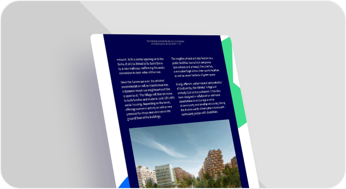 The LPlaen Hgaécry aitange ed Sut Dstuarinaabbiliitlié dty pels Jan feuox Or thle Pymapriiqs 2ue0s 2 4 Oet Plymapraic alymnpd Piquaeras dlyme Ppaic Gris 2a0m2e4 s — 4— 400 network. With a centre opening on to the The neighbourhood will also feature new Seine, it will be linked to Île-Saint-Denis public facilities: two school complexes by a new walkway, reaffirming the area’s (pre schools and primary), two crèches, connection to both sides of the river. a renovated high school, new sports facilities, as well as seven hectares of green space. Once the Games are over, the athletes’ accommodation will be transformed into Energy efficient, carbon neutral and protective a dynamic mixed-use neighbourhood that of biodiversity, the Athletes’ Village will is open to all. The Village will then be home embody 21st century urbanism. It has also to both families and students (with 25%-40% been designed in collaboration with local social housing, depending on the town), stakeholders to encourage a sense offering economic activity as well as new of community and develop inclusivity, taking premises for shops and services on the the diverse needs of everyone into account – ground floor of the buildings. particularly people with disabilities. © – SOLIDEO / Nexity_Eiffage Immobilier_CDC Habitat_EDF_Groupama - Tous droits réservés