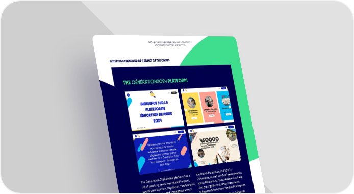 The Legacy and Sustainability plan for the Paris 2024 Olympic and Paralympic Games — 85 INITIATIVES LAUNCHED AS A RESULT OF THE GAMES THE GÉNÉRATION2024 PLATFORM The Generation 2024 online platform has a the French Paralympic and Sports list of teaching resources related to sport, Committee, as well as school and university sports participation, Olympism, Paralympism sports federations. Sports federations have and all subjects taught throughout school. also put together educational resources Launched in November 2020, the platform to help teachers better understand their sports. seeks to help teachers prepare their lessons The goal is to leverage sport and the Games and projects. It is designed for the entire to create a Generation 2024 community educational community, including parents, for students and their wellbeing. The platform teachers and the young people themselves. will report on news and projects to highlight Paris 2024 works alongside a number the things people are doing on the ground, of stakeholders, including the French Ministry particularly PE teachers. All the content will of National Education, Youth and Sport be harmonised and supplemented to provide and its decentralised departments, the French teachers with coherent tools to plan projects National Olympic and Sports Committee, throughout the year.
