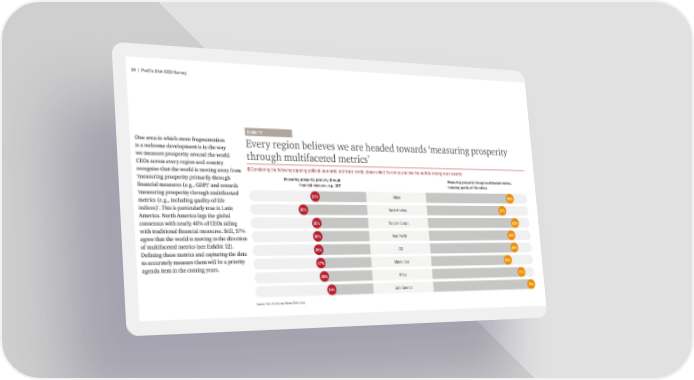 24 | PwC’s 21st CEO Survey Ehiit 12 One area in which more fragmentation Every region believes we are headed towards ‘measuring prosperity is a welcome development is in the way we measure prosperity around the world. through multifaceted metrics’ CEOs across every region and country recognise that the world is moving away from Q onsidering the following opposing political, economic, and trade trends, please select the one you believe the world is moving more towards ‘measuring prosperity primarily through eas–rin‘ prosperity primarily thro–‘h eas–rin‘ prosperity thro–‘h m–ltiˆacete† metrics financial measures (e.g., GDP)’ and towards financial meas–res eБР“D‚ incl–†in‘ ›–alityœoˆœliˆe in†ices ‘measuring prosperity through multifaceted 28% Global 66% metrics (e.g., including quality-of-life indices)’. This is particularly true in Latin 39% •ort‹ A…erŠca 57% America. North America lags the global consensus with nearly 40% of CEOs siding 28% —estern Euroe 69% with traditional financial measures. Still, 57% agree that the world is moving in the direction 28% AsŠa†PacŠfic 64% of multifaceted metrics (see Exhibit 12). Defining those metrics and capturing the data 28% CEE 66% to accurately measure them will be a priority 27% šŠle East 58% agenda item in the coming years. 25% A˜rŠca 71% 19% ”atŠn A…erŠca 79% Source: PwC, 21st Annual Global CEO Sure