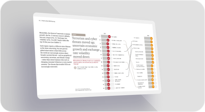 14 | PwC’s 21st CEO Survey 217 218 Meanwhile, the threat of ‘uncertain economic Ehiit 7 1 42% Oer†reŒulatŠon Oer†reŒulatŠon 42% growth’, the No. 2 ‘extreme concern’ globally last year, drops to No. 13. ‘Exchange rate Terrorism and cyber 2 34% ›ncertaŠn econo…Šc Œrowt‹ £errorŠs… 41% volatility’ at No. 3 in 2017 barely makes the threats moved up; top 10 this year (see Exhibit 7). 3 31% EŽc‹anŒe rate olatŠlŠt GeoolŠtŠcal uncertaŠnt 4% Each region reports a different mix of threats uncertain economic 4 31% AaŠlabŠlŠt o˜ ‡e s‡Šlls Cber t‹reats 4% as the most concerning, but one general growth and exchange global observation is that CEOs across 5 31% GeoolŠtŠcal uncertaŠnt AaŠlabŠlŠt o˜ ‡e s‡Šlls 38% the world are increasingly anxious about rate volatility 6 29% See o˜ tec‹noloŒŠcal c‹anŒe See o˜ tec‹noloŒŠcal 38% broader societal threats – such as geopolitical moved down c‹anŒe uncertainty, terrorism, and climate change 7 29% ™ncreasŠnŒ taŽ buren ™ncreasŠnŒ taŽ buren 36% –rather than direct business risks such as Q onsidering the following threats to your organisation’s changing consumer behaviour or new market growth prospects, how concerned are you about the 8 26% C‹anŒŠnŒ consu…er be‹aŠour PoulŠs… 35% entrants. The threats that trouble CEOs are following? ClŠ…ate c‹anŒe an increasingly existential. 9 24% SocŠal ŠnstabŠlŠt enŠron…ental a…aŒe 31% i C‹art s‹ows ercentaŒe o˜ resonents answerŠnŒ ‘eŽtre…el concerne’ƒ 1 24% Cber t‹reats EŽc‹anŒe rate olatŠlŠt 29% 11 2% ¤olatŠle co……oŠt rŠces SocŠal ŠnstabŠlŠt 29% 12 2% £errorŠs… ProtectŠonŠs… 29% 13 2% ™nae¥uate basŠc ›ncertaŠn econo…Šc Œrowt‹ 26% Šn˜rastructure 14 19% ProtectŠonŠs… ™nae¥uate basŠc 26% Šn˜rastructure Source: PwC, 21st Annual Global CEO Sure 15 19% ”ac‡ o˜ trust Šn busŠness C‹anŒŠnŒ consu…er 26% ase: All resonents 2018 1,23€ 2017 1,37‚ be‹aŠour