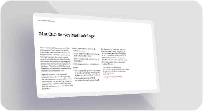 29 | PwC’s 21st CEO Survey 21st CEO Survey Methodology PwC conducted 1,293 interviews with CEOs • 40% of companies had revenues of We also conducted face-to-face, in-depth in 85 countries. Our sample is weighted by $1 billion or more. interviews with CEOs and thought leaders national GDP to ensure that CEOs’ views are • 35% of companies had revenues between from five continents over the fourth quarter fairly represented across all major countries. $100 million and $1 billion. of 2017. Their interviews are quoted in this The interviews were also spread across a report, and more extensive extracts can be range of industries. Further details by region • 20% of companies had revenues of up to found on our website at ceosurvey.pwc.com, and industry are available by request. Eleven $100 million. where you can also explore responses by percent of the interviews were conducted by • 56% of companies were privately owned. sector and location. telephone, 77% online, and 12% by post or face-to-face. All quantitative interviews were Notes The research was undertaken by conducted on a confidential basis. • Not all figures add up to 100%, as a result PwC Research, our global centre of excellence of rounding percentages and exclusion of for primary research and evidence-based The lower threshold for all companies ‘neither/nor’ and ‘don’t know’ responses. consulting services included in the top 10 countries (by GDP) www.pwc.co.uk/pwcresearch. was 500 employees or revenues of more than • The base for figures is 1,293 (all US$50 million. The threshold for companies respondents) unless otherwise stated. included in the next 20 countries was more than 100 employees or revenues of more than $10 million.