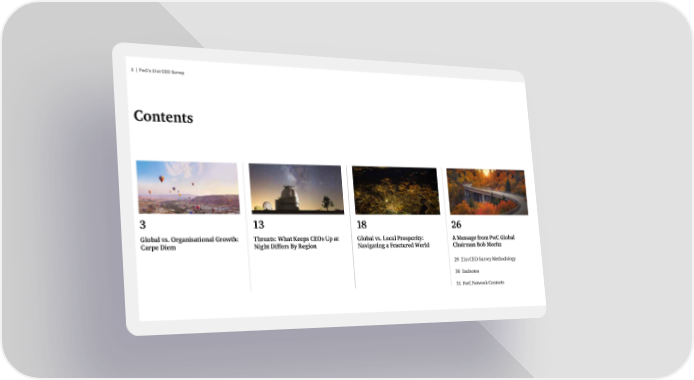 2 | PwC’s 21st CEO Survey Contents 3 13 18 26 Global vs. Organisational Growth: Threats: What Keeps CEOs Up at Global vs. Local Prosperity: A Message from PwC Global Carpe Diem Night Differs By Region Navigating a Fractured World Chairman Bob Moritz 29 21st CEO Survey Methodology 30 Endnotes 31 PwC Network Contacts