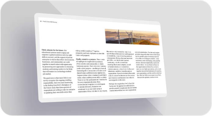 28 | PwC’s 21st CEO Survey 10 and with stakeholders. The data and insights Third, educate for the future. Our relying on their employer. Together, they erode a vital commodity: trust. In an educational systems need to equip and companies and their employees can meet the age of enhanced transparency and heightened provided along with other views of the future empower a global workforce with the right future well prepared. accountability, a loss of trust has profound and its possible paths of evolution leave all skills to succeed, and the support of private consequences. Perhaps the most important of us with a lot of things to consider – some enterprise is vital to that effort. Governments, Finally, commit to a purpose. These trends job CEOs – and the broader business worrisome, some challenging, some possibly businesses, and communities can work all highlight the heightened expectations community – can do to contribute divisive. But more importantly, much to be together to match talent with opportunity of the societies and communities in which meaningfully to social progress, as well excited about – we can choose to focus on by pioneering new approaches to educating businesses operate. That’s why every business as business results, is to commit to a the opportunities in front of us, to rise to students and training workers in the fields needs a clear purpose – one that goes beyond common purpose, a shared set of values and meet our own high expectations, and to work that will matter in a technology-enabled financial goals to incorporate a broader set of behaviours, and drive them through our together towards the betterment of ourselves, job market. shared values and behavioural expectations. organisations. Beyond articulating the words, our organisations, and the world in which we Purpose defines ‘who’ a business is and why it each of us must live them in our own actions live. Like the CEOs in our report, we at PwC, The good news is that most CEOs in our exists; values and behaviours define a culture. and behaviours and measure how others in choose to be optimists, anxious or not. survey recognise this ongoing reskilling These act as vital guideposts and benchmarks our companies do the same. responsibility. And even more heartening for every important decision. From is the finding from PwC’s Workplace of environmental footprints to social impacts We hope the insights from PwC’s 21st CEO the Future study that three-quarters of to investor demands, businesses are Survey and the approaches outlined above respondents are willing to take the initiative scrutinised by an ever-wider array of provide you with insights and ideas for further in updating their own skills rather than stakeholders. If they fall short in any respect, consideration within your own organisations