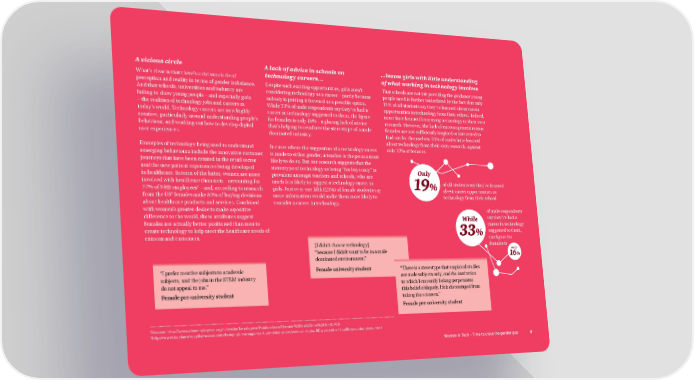 A vicious circle A lack of advice in schools on ...leaves girls with little understanding What’s clear is that there’s a vicious circle of technology careers… of what working in technology involves perception and reality in terms of gender imbalance. Despite such exciting opportunities, girls aren’t That schools are not yet providing the guidance young And that schools, universities and industry are considering technology as a career – partly because people need is further underlined by the fact that only failing to show young people – and especially girls nobody is putting it forward as a possible option. 19% of all students say they’ve learned about career – the realities of technology jobs and careers in While 33% of male respondents say they’ve had a opportunities in technology from their school. Indeed, today’s world. Technology careers are now highly career in technology suggested to them, the figure more have learned from using technology or their own creative, particularly around understanding people’s for females is only 16% – a glaring lack of advice research. However, the lack of encouragement means behaviour, and working out how to develop digital that’s helping to reinforce the stereotype of a male- females are not sufficiently inspired or interested to user experiences. dominated industry. find out for themselves: 31% of males have learned about technology from their own research, against Examples of technology being used to understand In cases where the suggestion of a technology career only 12% of females. emerging behaviours include the innovative customer is made to either gender, a teacher is the person most journeys that have been created in the retail sector likely to do so. But our research suggests that the and the new patient experiences being developed stereotype of technology as being “for boys only” is Only in healthcare. In term of the latter, women are more prevalent amongst teachers and schools, who are involved with healthcare than men – accounting for much less likely to suggest a technology career to 19% of all students say they’ve learned 8 77% of NHS employees – and, according to research girls. Just over one fifth (21%) of female students say about career opportunities in 9 from the US females make 80% of buying decisions more information would make them more likely to technology from their school about healthcare products and services. Combined consider a career in technology. with women’s greater desire to make a positive of male respondents difference to the world, these attributes suggest While say they’ve had a females are actually better positioned than men to career in technology create technology to help meet the healthcare needs of 33% suggested to them, citizens and customers. the figure for [I didn’t choose technology] females is “because I didn’t want to be in a male only dominated environment.” 16% “I prefer creative subjects to academic Female university student “There is a stereotype that empirical studies subjects, and the jobs in the STEM industry are male subjects only, and the institution do not appeal to me.” to which I currently belong perpetuates Female pre-university student this belief obliquely. I felt discouraged from taking the sciences.” Female pre-university student 8Source: http://www.nhsemployers.org/~/media/Employers/Publications/Gender%20in%20the%20NHS.PDF 9http://www.beckershospitalreview.com/hospital-management-administration/women-make-80-percent-of-healthcare-decisions.html Women in Tech – Time to close the gender gap 8