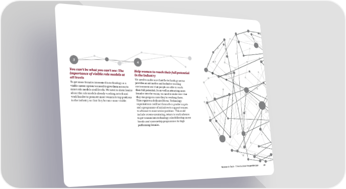 3 4 You can’t be what you can’t see: The Help women to reach their full potential importance of visible role models at in the industry all levels We need to make sure that the technology sector To get more females interested in technology as a provides an attractive and inclusive working viable career option we need to give them access to environment and that people are able to reach more role models at all levels. We need to shout louder their full potential. So as well as attracting more about the role models already working in tech and females into the sector, we need to make sure that work harder to promote more women to top positions they can progress once they’re working there. in the industry so that they become more visible. This requires a dedicated focus. Technology organisations could set themselves gender targets and a programme of initiatives to support women to advance to more senior positions. This could include reverse mentoring, return to work schemes to get women into technology roles following career breaks and sponsorship programmes for high performing females. Women in Tech – Time to close the gender gap 12