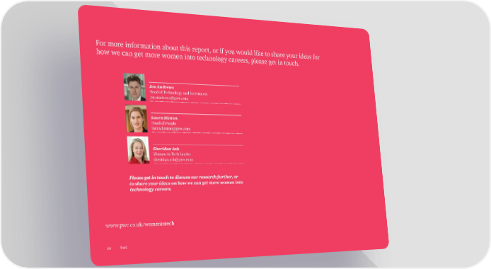 For more information about this report, or if you would like to share your ideas for how we can get more women into technology careers, please get in touch. Jon Andrews Head of Technology and Investment [email protected] Laura Hinton Head of People [email protected] Sheridan Ash Women in Tech Leader [email protected] Please get in touch to discuss our research further, or to share your ideas on how we can get more women into technology careers. www.pwc.co.uk/womenintech 13 PwC