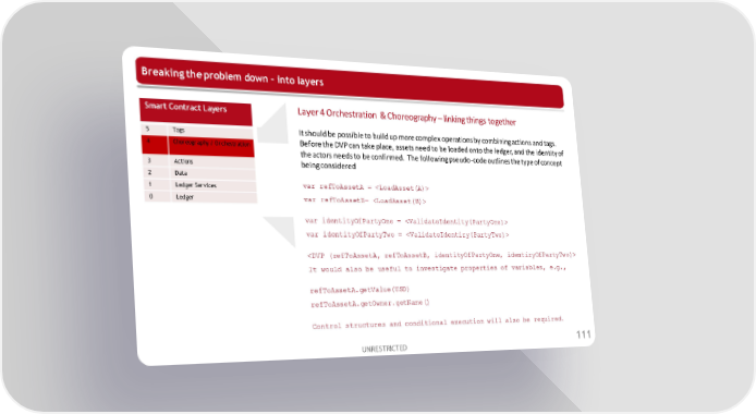 Breaking the problem down – into layers Smart Contract Layers Layer 4 Orchestration & Choreography – linking things together 5 Tags It should be possible to build up more complex operations by combining actions and tags. 4 Choreography / Orchestration Before the DVP can take place, assets need to be loaded onto the ledger, and the identity of the actors needs to be confirmed. The following pseudo-code outlines the type of concept 3 Actions being considered 2 Data 1 Ledger Services var refToAssetA = 0 Ledger var refToAssetB= var identityOfPartyOne = var identityOfPartyTwo = It would also be useful to investigate properties of variables, e.g., refToAssetA.getValue(USD) refToAssetA.getOwner.getName() Control structures and conditional execution will also be required. UNRESTRICTED 111