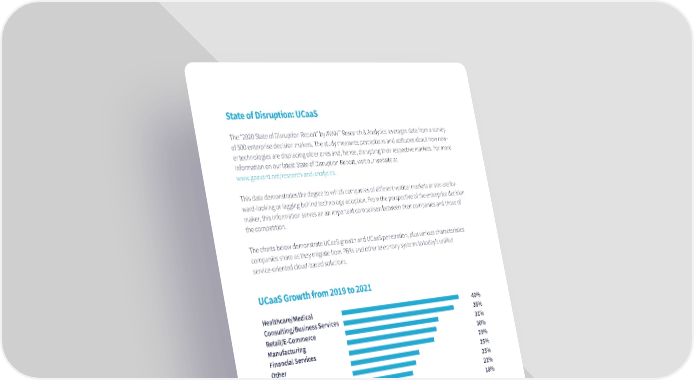 State of Disruption: UCaaS The “2020 State of Disruption Report” by AVANT Research & Analytics leverages data from a survey of 500 enterprise decision makers. The study measures perceptions and attitudes about how new- er technologies are displacing older ones and, hence, disrupting their respective markets. For more information on our latest State of Disruption Report, visit our website at www.goavant.net/research-and-analytics. This data demonstrates the degree to which companies of different vertical markets or size are for- ward-looking or lagging behind technology adoption. From the perspective of the enterprise decision maker, this information serves an an important comparison between their companies and those of the competition. The charts below demonstrate UCaaS growth and UCaaS penetration, plus various characteristics companies share as they migrate from PBXs and other telephony systems to today’s unified service-oriented cloud-based solutions. UCaaS Growth from 2019 to 2021 Healthcare/Medical 40% Consulting/Business Services 38% Retail/E-Commerce 31% Manufacturing 30% Financial Services 29% Other 25% Legal 23% Construction/Engineering 21% High Tech 18% Source: AVANT Assesment Data Healthcare/Medical posts the highest growth rates, with the Consulting/Business Services growth rate following closely behind. The remainder of the verticals trail the two leaders in a relatively close-knit cluster. Copyright © 2020 AVANT Communications, Inc. 9