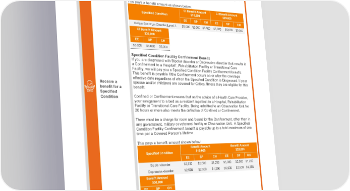 Specified Conditions Rider ** Specified Conditions Diagnosis Benefit We will pay you a Specified Condition Diagnosis benefit if you are diagnosed with Autism Spectrum Disorder Level 3 on or after the coverage effective date. If your spouse and/or child(ren) are covered for Critical Illness, they are eligible for this benefit, also. This pays a benefit amount as shown below: CI Benefit Amount CI Benefit Amount Specified Condition $10,000 $20,000 EE SP CH EE SP CH Autism Spectrum Disorder Level 3 $5,000 $5,000 $5,000 $5,000 $5,000 $5,000 CI Benefit Amount $30,000 EE SP CH $5,000 $5,000 $5,000 Specified Condition Facility Confinement Benefit If you are diagnosed with Bipolar disorder or Depressive disorder that results in a Confinement to a Hospital*, Rehabilitation Facility or Transitional Care Facility, we will pay you a Specified Condition Facility Confinement benefit. This benefit is payable if the Confinement occurs on or after the coverage effective date regardless of when the Specified Condition is Diagnosed. If your Receive a spouse and/or child(ren) are covered for Critical Illness they are eligible for this benefit for a benefit. Specified Condition Confined or Confinement means that on the advice of a Health Care Provider, your assignment to a bed as a resident inpatient in a Hospital, Rehabilitation Facility or Transitional Care Facility. Being admitted to an Observation Unit for 20 hours or more also meets the definition of Confined or Confinement. There must be a charge for room and board for the Confinement, other than in any government, military or veterans’ facility or Observation Unit. A Specified Condition Facility Confinement benefit is payable up to a total maximum of one time per a Covered Person’s lifetime. This pays a benefit amount shown below: Benefit Amount Benefit Amount Specified Condition $10,000 $20,000 EE SP CH EE SP CH Bipolar disorder $2,500 $2,500 $1,250 $5,000 $2,500 $1,250 Depressive disorder $2,500 $2,500 $1,250 $5,000 $2,500 $1,250 Benefit Amount $30,000 EE SP CH $7,500 $2,500 $1,250 $7,500 $2,500 $1,250 **This rider is subject to approval by the Iowa Department of Insurance and Financial Services – Insurance Division and may change. Any claims that are filed prior to state approval may be delayed.