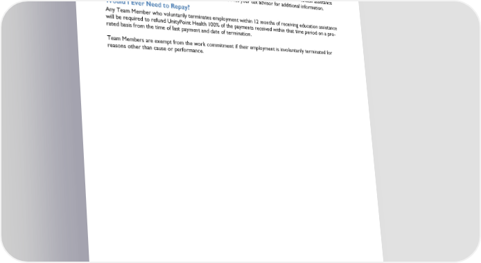 Page 6 Will I Be Taxed? In compliance with IRS regulations (section 127), employer-provided educational assistance is exempt from taxation up to a maximum of $5,250 per calendar year. Amounts over $5,250 may be exempt from taxation if the education qualifies as work-related education (section 132). Taxes will be assessed for non-qualifying work- related education if, at the time of payment processing, the Team Member’s total amount of tuition assistance paid in the calendar year exceeds $5,250. Please consult with your tax advisor for additional information. Would I Ever Need to Repay? Any Team Member who voluntarily terminates employment within 12 months of receiving education assistance will be required to refund UnityPoint Health 100% of the payments received within that time period on a pro- rated basis from the time of last payment and date of termination. Team Members are exempt from the work commitment if their employment is involuntarily terminated for reasons other than cause or performance. © 2023 Bright Horizons Family Solutions LLC. All Rights Reserved.