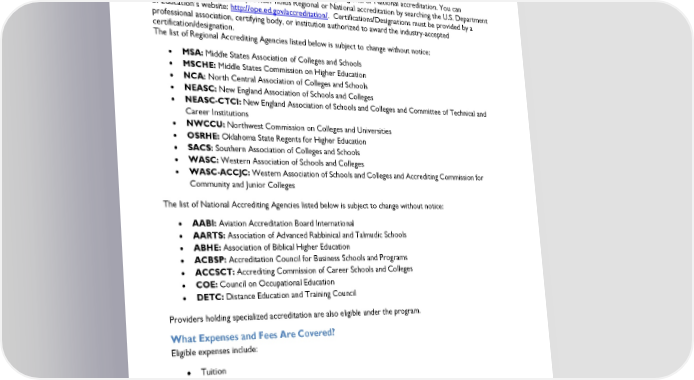 Page 4 If you don’t see your Field of Study (or one that is similar) already listed in the system, you can select “Other” and fill it in. What Schools or Providers Can I Attend? All coursework must be provided by an institution holding Regional or National accreditation. You can determine if your school or provider holds Regional or National accreditation by searching the U.S. Department of Education’s website: http://ope.ed.gov/accreditation/. Certifications/Designations must be provided by a professional association, certifying body, or institution authorized to award the industry-accepted certification/designation. The list of Regional Accrediting Agencies listed below is subject to change without notice: MSA: Middle States Association of Colleges and Schools MSCHE: Middle States Commission on Higher Education NCA: North Central Association of Colleges and Schools NEASC: New England Association of Schools and Colleges NEASC-CTCI: New England Association of Schools and Colleges and Committee of Technical and Career Institutions NWCCU: Northwest Commission on Colleges and Universities OSRHE: Oklahoma State Regents for Higher Education SACS: Southern Association of Colleges and Schools WASC: Western Association of Schools and Colleges WASC-ACCJC: Western Association of Schools and Colleges and Accrediting Commission for Community and Junior Colleges The list of National Accrediting Agencies listed below is subject to change without notice: AABI: Aviation Accreditation Board International AARTS: Association of Advanced Rabbinical and Talmudic Schools ABHE: Association of Biblical Higher Education ACBSP: Accreditation Council for Business Schools and Programs ACCSCT: Accrediting Commission of Career Schools and Colleges COE: Council on Occupational Education DETC: Distance Education and Training Council Providers holding specialized accreditation are also eligible under the program. What Expenses and Fees Are Covered? Eligible expenses include: Tuition Books Course related fees Your tuition and eligible expenses will be paid at 100% up to your annual benefit amount. Team Members are responsible for all ineligible expenses including, but not limited to: Meals Lodging Transportation © 2023 Bright Horizons Family Solutions LLC. All Rights Reserved.
