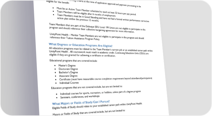 Page 3 Eligibility and Using My Benefits What Are the Eligibility Requirements? You must meet the following criteria at the time of application approval and payment processing to be eligible for the benefit: Must be an Active Team Member scheduled to work at least 32 hours per pay period. Team Members will be eligible after 6 months of employment. Team Members must be in Good Standing and have not had a formal written performance corrective action plan within the previous 12 months. Team Members that are part of the Dubuque SEIU Local 199 Union are not eligible to participate in this program and should reference their collective bargaining agreement for more information. UnityPoint Health – Meriter Team Members are not eligible to participate in this program and should reference their Tuition Assistance Program Policy. What Degrees or Education Programs Are Eligible? All education programs must be related to the Team Member’s current job or an established career path within UnityPoint Health . All coursework must result in academic credit. Continuing Education Units (CEUs) are eligible if they are granted for achieving a certificate or certification. Educational programs that are covered include: Master's Degree Doctorate Degree Bachelor's Degree Associate Degree Certificate (must have measurable course completion requirement beyond attendance/participation) Individual Courses Education programs that are not covered include, but are not limited to: Individual courses for sports, recreation, or hobbies, unless part of a degree program Seminars, conferences, and workshops What Majors or Fields of Study Can I Pursue? Eligible Fields of Study should relate to your established career path within UnityPoint Health. Majors or Fields of Study that are covered include, but are not limited to: Accounting Business Administration Finance Information Technology Management Nursing © 2023 Bright Horizons Family Solutions LLC. All Rights Reserved.
