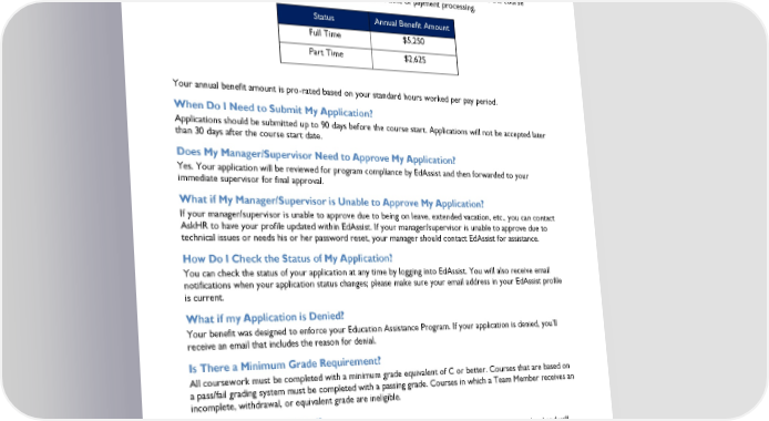 Page 5 Tools, materials, or supplies (other than textbooks) that can be kept after completing the course of instruction How Much Can I Spend? Eligible expenses will be covered up to the annual benefit amount for the calendar year in which the course ends. Payment amounts are based on your FT/PT status at the time of payment processing. Status Annual Benefit Amount Full Time $5,250 Part Time $2,625 Your annual benefit amount is pro-rated based on your standard hours worked per pay period. When Do I Need to Submit My Application? Applications should be submitted up to 90 days before the course start. Applications will not be accepted later than 30 days after the course start date. Does My Manager/Supervisor Need to Approve My Application? Yes. Your application will be reviewed for program compliance by EdAssist and then forwarded to your immediate supervisor for final approval. What if My Manager/Supervisor is Unable to Approve My Application? If your manager/supervisor is unable to approve due to being on leave, extended vacation, etc., you can contact AskHR to have your profile updated within EdAssist. If your manager/supervisor is unable to approve due to technical issues or needs his or her password reset, your manager should contact EdAssist for assistance. How Do I Check the Status of My Application? You can check the status of your application at any time by logging into EdAssist. You will also receive email notifications when your application status changes; please make sure your email address in your EdAssist profile is current. What if my Application is Denied? Your benefit was designed to enforce your Education Assistance Program. If your application is denied, you’ll receive an email that includes the reason for denial. Is There a Minimum Grade Requirement? All coursework must be completed with a minimum grade equivalent of C or better. Courses that are based on a pass/fail grading system must be completed with a passing grade. Courses in which a Team Member receives an incomplete, withdrawal, or equivalent grade are ineligible. How Do I Get Reimbursed? Upon application approval, you are responsible to make all required payments directly to your school and will be reimbursed for eligible expenses upon successful course completion. You must submit proof of successful course completion (grades) and an itemized invoice of tuition and fees within 60 days after course completion in order to receive reimbursement. You will receive an automated email notification when your application is processed for payment, and you should receive your payment via payroll within1-2 pay periods. © 2023 Bright Horizons Family Solutions LLC. All Rights Reserved.