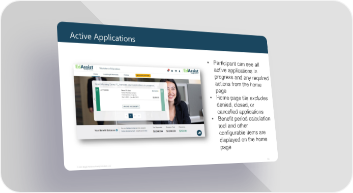Active Applications • Participant can see all active applications in progress and any required actions from the home page • Home page tile excludes denied, closed, or cancelled applications • Benefit period calculation tool and other configurable items are displayed on the home page © 2021 Bright Horizons Family Solutions LLC 13