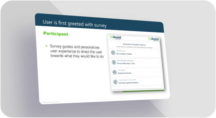 EdAssist Participant Tutorial Page 1 Page 3User is first greeted with survey Participant Survey guides and personalizes user experience to direct the user towards what they would like to do © 2021 Bright Horizons Family Solutions LLC 2