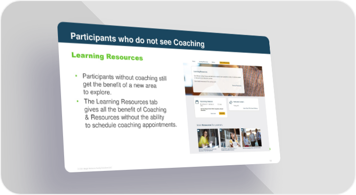 Participants who do not see Coaching Learning Resources • Participants without coaching still get the benefit of a new area to explore. • The Learning Resources tab gives all the benefit of Coaching &Resources without the ability to schedule coaching appointments. © 2021 Bright Horizons Family Solutions LLC 12