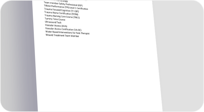 Radiological Technologist (RT) Registered Cardiovascular Invasive Specialist Registered Electroencephalographic Technologist Registered Respiratory Therapist (RRT) Safe Kids Worldwide (2-year recert) Schroth Certified Physical Therapist Sexual Assault Nurse Examiner (SANE-A) SHSMD Marketing Certificate Specialist in Blood Banking (SBB) Certification Specialist in Hematology Team member Safety Professional (ASP) Titleist Performance (TPI) Level 1 Certification Trauma Focused Cognitive (TF-CBT) Trauma Nurse Certification (TCRN) Trauma Nursing Care Course (TNCC) Tummy Time Course Ultrasound Tech Vascular Access (AVA) Vascular Access Certification (VA-BC) Water Based Interventions for Peds Therapist Wound Treatment Team Member