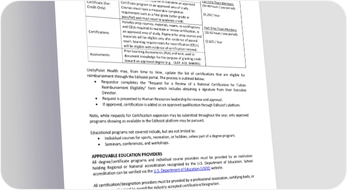 Education Program Eligibility Criteria Annual Benefit Amount Associate Degree Bachelor’s Degree Includes all undergraduate / graduate level coursework Master’s Degree required to complete an approved degree. Courses Doctorate / PhD should result in a final grade (letter grade or pass/fail). MBA / EMBA JD Full-Time Team Members Includes all courses required to complete an approved (64-80 hours / pay period): Certificate program in an approved area of study. Certificate (For- Courses must have a measurable completion $5,250 / Year Credit Only) requirement such as a final grade (letter grade or pass/fail) and must result in academic credit. Part-Time Team Members Includes prep courses, materials, exams, re-certifications (32-63 hours / pay period): and CEUs required to maintain or renew certification, in an approved area of study. Payment for prep courses and Certifications $2,625 / Year materials will be eligible only after evidence of passed exam. Learning requirements for recertification (CEUs) will be eligible with evidence of certification renewal. Prior Learning Assessments (PLA) and tests used to Assessments document knowledge for the purpose of granting credit toward an approved degree (e.g. - CLEP, ACE, DANTES). UnityPoint Health may, from time to time, update the list of certifications that are eligible for reimbursement through the EdAssist portal. The process is outlined below: Requestor completes the “Request for a Review of a National Certification for Tuition Reimbursement Eligibility” form which includes obtaining a signature from their Executive Director. Request is presented to Human Resources leadership for review and approval. If approved, certification is added as an approved qualification through EdAssist’s platform. Note, while requests for Certification expansion may be submitted throughout the year, only approved programs showing as available in the EdAssist platform may be pursued. Educational programs not covered include, but are not limited to: Individual courses for sports, recreation, or hobbies, unless part of a degree program. Seminars, conferences, and workshops. APPROVABLE EDUCATION PROVIDERS All degree/certificate programs and individual course providers must be provided by an institution holding Regional or National accreditation recognized by the U.S. Department of Education. School accreditation can be verified via the U.S. Department of Education (USDE) website. All certification/designation providers must be provided by a professional association, certifying body, or institution authorized to award the industry accepted certification/designation. COURSE COMPLETION REQUIREMENTS All courses related to a degree or certificate program must be completed with a minimum grade equivalent of C or better and award college credit. Courses that are based on a pass/fail grading system must be completed with a passing grade. Courses in which a Team Member receives an incomplete, withdrawal, or equivalent grade are ineligible.