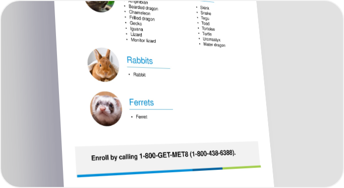 Reptiles • Amphibian • Skink • Bearded dragon • Snake • Chameleon • Tegu • Frilled dragon • Toad • Gecko • Tortoise • Iguana • Turtle • Lizard • Uromastyx • Monitor lizard • Water dragon Rabbits • Rabbit Ferrets • Ferret Enroll by calling 1-800-GET-MET8 (1-800-438-6388). Exotic pet coverage available for MetGen policies. May not be available in all states. Coverage issued by Metropolitan General Insurance Company (“MetGen”), a Rhode Island insurance company, headquartered at 700 Quaker Lane, Warwick, RI 02886. Availability is subject to regulatory approval. Coverage subject to restrictions, exclusions and limitations and application is subject to underwriting. See policy or contact MetLife Pet Insurance Solutions LLC (“MetLife Pet”) for details. MetLife Pet is the policy administrator. It may operate under an alternate or fictitious name in certain jurisdictions, including MetLife Pet Insurance Services LLC (New York and Minnesota), and MetLife Pet Insurance Solutions Agency LLC (Illinois). L1123036261[exp1125][All States][DC] © 2023 MetLife Services and Solutions, LLC — All Rights Reserved. © 2023 Peanuts Worldwide LLC