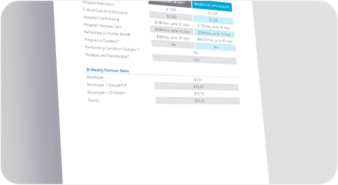 Hospital Indemnity Insurance, continued How much does Hospital Indemnity Insurance cover? STANDARD BENEFIT BENEFIT AT UPH FACILITY Hospital Admission $1,000 $1,250 Critical Care Unit Admission $2,000 $2,500 Hospital Con昀椀nement $100/day, up to 30 days $125/day, up to 30 days Hospital Intensive Care $200/day, up to 15 days $250/day, up to 15 days Rehabilitation Facility Bene昀椀t $50/day, up to 30 days $62.50/day, up to 30 days Pregnancy Covered? Yes Yes Pre-Existing Condition Exclusion? No Portable and Transferable? Yes Bi-Weekly Premium Rates Employee $9.39 Employee + Spouse/DP $18.20 Employee + Child(ren) $13.79 Family $22.60 | 30 |