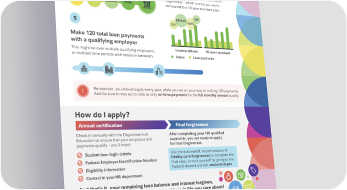 3 4 Have a federal direct loan Be enrolled in a qualifying If you don’t, you can consolidate repayment plan other types of federal loans such as: Keep in mind that an income-driven payment program will leave the most balance for forgiveness – which is what you want – FFEL Perkins Stafford PLUS compared to a 10-year standard plan. REPAYE IBR 5 ICR PAYE Make 120 total loan payments with a qualifying employer This might be over multiple qualifying employers, Income-driven 10-year standard or multiple time periods with breaks in between. Salary Loan payments Remember, you should apply every year, while you are on your way to making 120 payments. And be sure to stay up to date as only on-time payments for the full monthly amount qualify. How do I apply? Annual certification Final forgiveness Check in annually with the Department of After completing your 120 qualified Education to ensure that your employer and payments, you are ready to apply payments qualify – you’ll need: for final forgiveness. Student loan login details Use the automated, expert solution at Federal Employer Identification Number fidelity.com/forgiveness to complete this final step, or do it yourself by going to the Eligibility information Federal student aid site, studentaid.gov Contact in your HR department And that’s it, your remaining loan balance and interest forgiven, leaving you plenty to spend on the other things in life you care about! For help from an expert to determine your eligibility or support filling in your forms, visit Fidelity.com/forgiveness This is intended to be educational. Public Service Loan Forgiveness is a Department of Education sponsored program and is therefore subject to changes made by the government entity. It is not guaranteed. © 2022 FMR LLC. All rights reserved 1031937.2.0