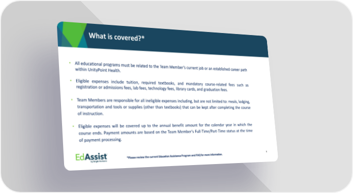 What is covered?* • All educational programs must be related to the Team Member’s current job or an established career path within UnityPoint Health. • Eligible expenses include tuition, required textbooks, and mandatory course-related fees such as registration or admissions fees, lab fees, technology fees, library cards, and graduation fees. • Team Members are responsible for all ineligible expenses including, but are not limited to: meals, lodging, transportation and tools or supplies (other than textbooks) that can be kept after completing the course of instruction. • Eligible expenses will be covered up to the annual benefit amount for the calendar year in which the course ends. Payment amounts are based on the Team Member’s Full-Time/Part-Time status at the time of payment processing. *Please review the current Education Assistance Program and FAQ for more information. 6