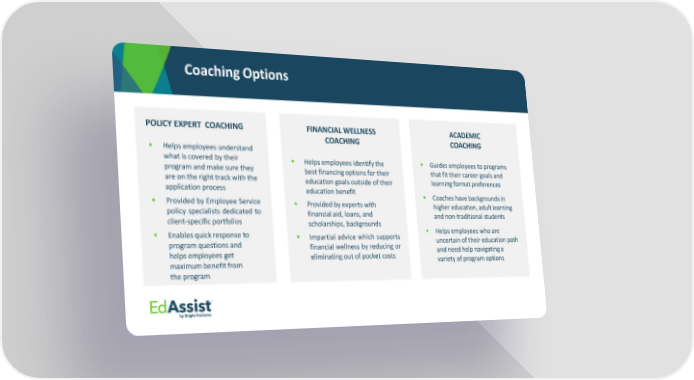 Coaching Options POLICY EXPERT COACHING FINANCIAL WELLNESS ACADEMIC COACHING COACHING ▪ Helps employees understand what is covered by their ▪ Helps employees identify the ▪ Guides employees to programs program and make sure they best financing options for their that fit their career goals and are on the right track with the education goals outside of their learning format preferences application process education benefit ▪ Coaches have backgrounds in ▪ Provided by Employee Service ▪ Provided by experts with higher education, adult learning policy specialists dedicated to financial aid, loans, and and non-traditional students client-specific portfolios scholarships, backgrounds ▪ Enables quick response to ▪ Impartial advice which supports ▪ Helps employees who are program questions and financial wellness by reducing or uncertain of their education path helps employees get eliminating out of pocket costs and need help navigating a maximum benefit from variety of program options the program