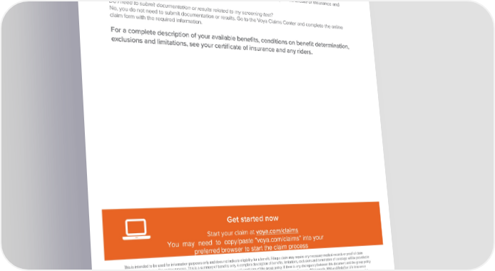 Additional FAQs Can I receive more than one Wellness Bene昀椀t payment per year? You are limited to one bene昀椀t payment per covered person, per eligible product, per calendar year. A maximum amount payable for all covered children in one calendar year may apply. One health screening can be used to satisfy the requirement for any insurance under which you are also covered by the Wellness Bene昀椀t. For a complete description of your available bene昀椀ts, exclusions and limitations, see your certi昀椀cate of insurance and any riders. Do I need to submit documentation or results related to my screening test? No, you do not need to submit documentation or results. Go to the Voya Claims Center and complete the online claim form with the required information. For a complete description of your available bene昀椀ts, conditions on bene昀椀t determination, exclusions and limitations, see your certi昀椀cate of insurance and any riders. Get started now Start your claim at voya.com/claims You may need to copy/paste "voya.com/claims" into your preferred browser to start the claim process This is intended to be used for information purposes only and does not indicate eligibility for a bene昀椀t. Filing a claim may require any necessary medical records or proof of claim as determined during the review process. This is a summary of bene昀椀ts only. A complete description of bene昀椀ts, limitations, exclusions and termination of coverage will be provided in the certi昀椀cate(s) of insurance and riders. All coverage is subject to the terms and conditions of the group policy. If there is any discrepancy between this document and the group policy documents, the policy documents will govern. Insurance products are issued and underwritten by ReliaStar Life Insurance Company (Minneapolis, MN) and ReliaStar Life Insurance Company of New York (Woodbury, NY). Within the State of New York, only ReliaStar Life Insurance Company of New York is admitted, and its products issued. Both are members of the Voya® family of companies. Voya Employee Bene昀椀ts is a division of both companies. Product provisions and availability may vary by state or employer’s plan. ©2021 Voya Services Company. All rights reserved. WLT250007584. 1494371 213330-04152021 213330_250007584_03.indd 2213330_250007584_03.indd 2 21/04/2021 17:3521/04/2021 17:35