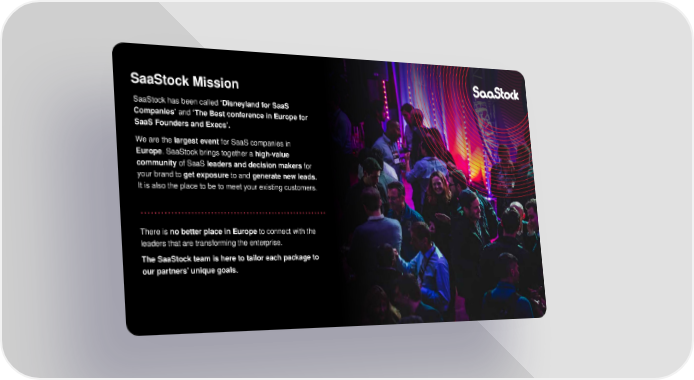 SaaStock Mission SaaStock has been called ‘Disneyland for SaaS Companies’ and ‘The Best conference in Europe for SaaS Founders and Execs’. We are the largest event for SaaS companies in Europe. SaaStock brings together a high-value community of SaaS leaders and decision makers for your brand to get exposure to and generate new leads. It is also the place to be to meet your existing customers. There is no better place in Europe to connect with the leaders that are transforming the enterprise. The SaaStock team is here to tailor each package to our partners’ unique goals.