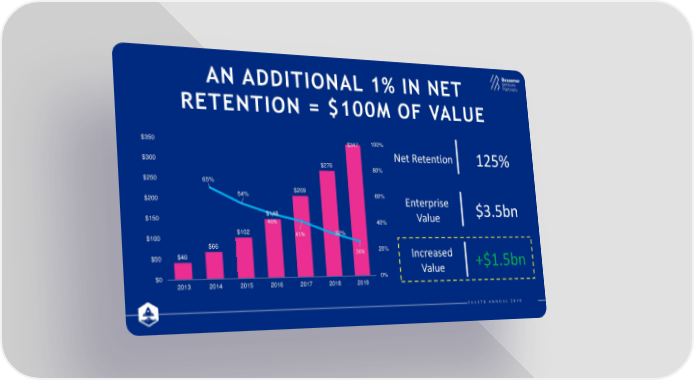 AN ADDITIONAL 1% IN NET RETENTION = $100M OF VALUE $350 $347 100% $300 Net Retention 125% $276 80% $250 65% 54% $209 60% $200 Enterprise $150 $148 Value $3.5bn 46% 40% $100 $102 41% 32% $66 20% $50 $40 26% Increased +$1.5bn $0 0% Value 2013 2014 2015 2016 2017 2018 2019 S A A S T R A N N U A L 2 0 1 9