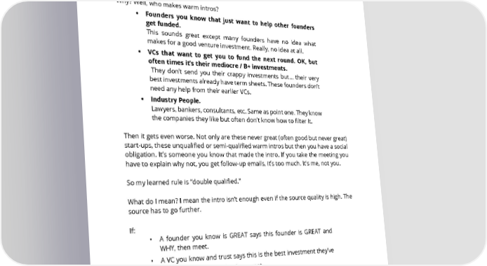 38. Why are VCs so adamant about warm intros? I‘ve learned 90% of warm intros are the biggest waste of time of all, unless they are “double qualified”. Why? Well, who makes warm intros? • Founders you know that just want to help other founders get funded. This sounds great except many founders have no idea what makes for a good venture investment. Really, no idea at all. • VCs that want to get you to fund the next round. OK, but often times it’s their mediocre / B+ investments. They don’t send you their crappy investments but... their very best investments already have term sheets. These founders don’t need any help from their earlier VCs. • Industry People. Lawyers, bankers, consultants, etc. Same as point one. They know the companies they like but often don’t know how to filter it. Then it gets even worse. Not only are these never great (often good but never great) start-ups, these unqualified or semi-qualified warm intros but then you have a social obligation. It’s someone you know that made the intro. If you take the meeting you have to explain why not, you get follow-up emails, it’s too much. It’s me, not you. So my learned rule is “double qualified.” What do I mean? I mean the intro isn’t enough even if the source quality is high. The source has to go further. If: • A founder you know is GREAT says this founder is GREAT and WHY, then meet. • A VC you know and trust says this is the best investment they’ve made in past 12 months, then meet. • An attorney, banker, etc. says this is the hottest company in their portfolio, then meet. • If any of the previous 3 aren’t met BUT the cold email is amazing and the founder got someone very high-quality to make the SAASTR.COM 34