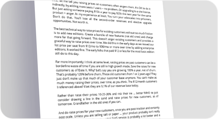 50. What is the best strategy for dramatically increasing the price of a SaaS product without angering customers? Two thoughts, one direct and one indirect. First, let me tell you raising prices on customers often angers them. It’s OK to do it indirectly, by adding more seats / users -- no problem. Or upgrading to a site license. But just asking someone paying $10k a year to pay $20k the next year for the same product = anger. In my experience at least. You turn your advocates into prisoners. Don’t do that. You’ll lose all the second-order revenues and elective upgrade opportunities. Not worth it. The best technical way to raise prices for existing customers without too much friction is to add new editions. Create a bundle of new features (not old ones) and charge more for that going forward. This doesn’t anger existing customers and provides a graceful way to raise prices over time. We did this in the early days as we moved our list price per seat from $12/mo to $36/mo or more over time by adding enterprise editions. It worked fine. The early folks that paid $12 or less for the most basic edition still do to this day. Far more importantly: I think at some level, raising prices on past customers can be a borderline waste of time if you are still in high growth mode. Save the raises for new customers as of Date X. Why? Let’s say you are growing 100% a year, net of churn. That’s probably 120% before churn. Those old customers from 1 or 2 years ago? They just don’t make up that much of your customer base anymore. You can’t make as much money raising their prices, over time, as you think. The $12/month customers I referenced above? I bet they are 0.1% of our revenue base today. Rather than raise their prices 10-20-30% and risk their ire ... better IMHO to just consider drawing a line in the sand and raise prices for new customers, as of tomorrow. Grandfather in the old ones if you can. And do raise prices for your new customers, once you are post-traction and certainly post-scale. Unless you are selling salt or paper ... your product probably isn’t really a commodity. After 1, 2, 3 years ... your SaaS service is probably a lot better and a more valuable product than when you started. So don’t be afraid to raise prices on new customers, over time. You’ve got the mini-brand, the reference customers, the enterprise features. Just be careful on existing ones. SAASTR.COM 45