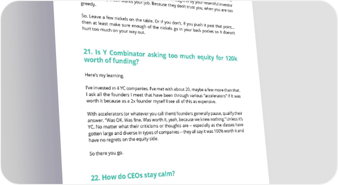 Until then -- take one misstep, miss one quarter and he or she will take you down if they have someone else “better” to put in. Turn around and you’ll notice they’ve placed some of their “guys” in your company who report behind your back to the investors. They stack your board. All around you and they have a “guy”, you think this person is your advisor... but really they’ve been brought in by your resentful investor to see if this person wants your job. Because they don’t trust you, when you are too greedy. So. Leave a few nickels on the table. Or if you don’t, if you push it past that point... then at least make sure enough of the nickels go in your back pocket so it doesn’t hurt too much on your way out. 21. Is Y Combinator asking too much equity for 120k worth of funding? Here’s my learning. I’ve invested in 4 YC companies. I’ve met with about 20, maybe a few more than that. I ask all the founders I meet that have been through various “accelerators” if it was worth it because as a 2x founder myself I see all of this as expensive. With accelerators (or whatever you call them) founders generally pause, qualify their answer. “Was OK. Was fine. Was worth it, yeah, because we knew nothing.” Unless it’s YC. No matter what their criticisms or thoughts are -- especially as the classes have gotten large and diverse in types of companies -- they all say it was 100% worth it and have no regrets on the equity side. So there you go. 22. How do CEOs stay calm? You must fake it. You cannot let anyone see you look like you are losing control. Ever. Once they see that ... they will lose faith. You need help. SAASTR.COM 18