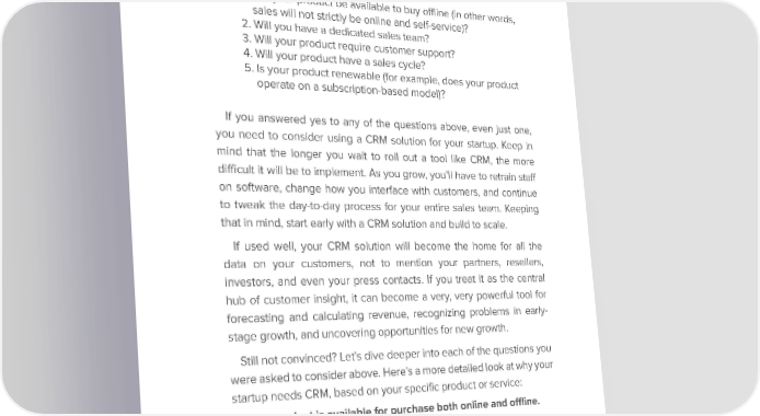 Despite the upfront time and financial commitments, all startups should make investing in CRM, and investing in one early, a top priority. This chapter will show you why. Why Your Startup Needs CRM Take a look at the questions below and answer yes or no. 1. Will your product be available to buy offline (in other words, sales will not strictly be online and self-service)? 2. Will you have a dedicated sales team? 3. Will your product require customer support? 4. Will your product have a sales cycle? 5. Is your product renewable (for example, does your product operate on a subscription-based model)? If you answered yes to any of the questions above, even just one, you need to consider using a CRM solution for your startup. Keep in mind that the longer you wait to roll out a tool like CRM, the more difficult it will be to implement. As you grow, you’ll have to retrain staff on software, change how you interface with customers, and continue to tweak the day-to-day process for your entire sales team. Keeping that in mind, start early with a CRM solution and build to scale. If used well, your CRM solution will become the home for all the data on your customers, not to mention your partners, resellers, investors, and even your press contacts. If you treat it as the central hub of customer insight, it can become a very, very powerful tool for forecasting and calculating revenue, recognizing problems in early- stage growth, and uncovering opportunities for new growth. Still not convinced? Let’s dive deeper into each of the questions you were asked to consider above. Here’s a more detailed look at why your startup needs CRM, based on your specific product or service: 1. Your product is available for purchase both online and offline. If you’re selling your product(s) both online and offline, a CRM platform is critical because you need a place to marry the work that your sales team and your online sales platform are doing. How else are you going to ensure that your salespeople aren’t phoning leads that have already purchased your product or service online? Or perhaps, more importantly, how are you ensuring your sales team has access to customers who have made smaller purchases online, so that they can be contacted and upsold?