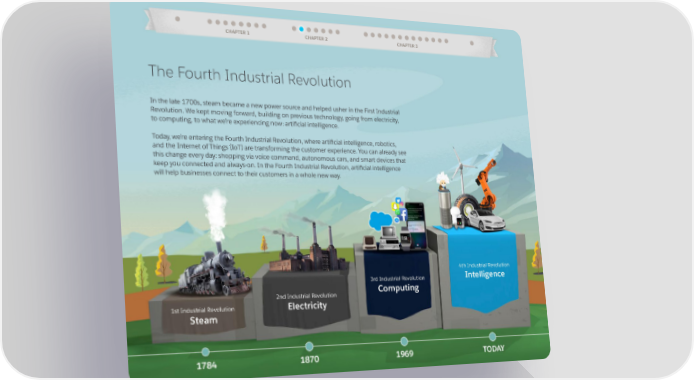 CHAPTER 1 CHAPTER 2 CHAPTER 3 The Fourth Industrial Revolution In the late 1700s, steam became a new power source and helped usher in the First Industrial Revolution. We kept moving forward, building on previous technology, going from electricity, to computing, to what we’re experiencing now: artificial intelligence. Today, we’re entering the Fourth Industrial Revolution, where artificial intelligence, robotics, and the Internet of Things (IoT) are transforming the customer experience. You can already see this change every day: shopping via voice command, autonomous cars, and smart devices that keep you connected and always-on. In the Fourth Industrial Revolution, artificial intelligence will help businesses connect to their customers in a whole new way. 4th Industrial Revolution 3rd Industrial Revolution Intelligence 2nd Industrial Revolution Computing 1st Industrial Revolution Electricity Steam