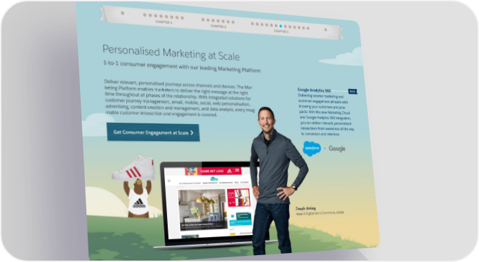 CHAPTER 1 CHAPTER 2 CHAPTER 3 Personalised Marketing at Scale 1-to-1 consumer engagement with our leading Marketing Platform Deliver relevant, personalised journeys across channels and devices. The Mar- Google Analytics 360 NEW keting Platform enables marketers to deliver the right message at the right Delivering smarter marketing and time throughout all phases of the relationship. With integrated solutions for customer engagement all starts with customer journey management, email, mobile, social, web personalisation, knowing your customers and pros- advertising, content creation and management, and data analysis, every imag- pects. With the new Marketing Cloud inable customer interaction and engagement is covered. and Google Analytics 360 integration, you can deliver relevant, personalised interactions from awareness all the way Get Consumer Engagement at Scale to conversion and retention. Joseph Godsey Head of Digital Brand Commerce, adidas