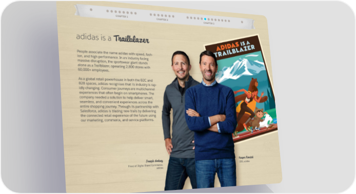 CHAPTER 1 CHAPTER 2 CHAPTER 3 adidas is a Trailblazer People associate the name adidas with speed, fash- ion, and high performance. In an industry facing massive disruption, the sportswear giant stands alone as a Trailblazer, operating 2,800 stores with 60,000+ employees. As a global retail powerhouse in both the B2C and B2B spaces, adidas recognises that its industry is rap- idly changing. Consumer journeys are multichannel experiences that often begin on smartphones. The company needed a solution to help deliver smart, seamless, and convenient experiences across the entire shopping journey. Through its partnership with Salesforce, adidas is blazing new trails by delivering the connected retail experience of the future using our marketing, commerce, and service platforms. Joseph Godsey Kasper Rørsted Head of Digital Brand Commerce, CEO, adidas adidas