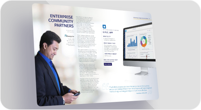 Embracing change early and often 9 Pradip Sitaram oversees the direction ENTERPRISE and management of the information technology portfolio for Enterprise Community Partners, a national COMMUNITY organization that creates and advocates for affordable homes in thriving communities. As CIO and SVP, Sitaram PARTNERS has led the modernization of the company’s IT department by using ENTERPRISE COMMUNITY PARTNER’S cloud technology to automate business Pradip Sitaram processes, bring together disparate data E.P.I.C. APP SVP and CIO sources, and build custom applications. “When I started at Enterprise, we had WHAT IS IT? issues with every facet of the technology An app for employees to stack,” says Sitaram. “There was a huge manage loan applications Founded: 1982 landscape of very complex applications HQ: Columbia, MD and databases. Some were extremely Workforce: 600+ siloed so they did not talk to anything WHAT DOES IT DO? Industry: Non-Profit/ else and others were so tightly integrated Gives employees a place to Social enterprise you couldn’t change anything without manage loans. This includes breaking something else.” information on the distribution, Working with Salesforce, one of Sitaram’s oversight, and reporting for all developers built an automation solution loans in the portfolio. in just a few weeks. “This gave us an early win we could use to gain support for HOW WAS IT BUILT? projects later on,“ he says. “Cloud-based On Force.com. technology is very conducive to this kind of agile development, because you can dip your toe in to test the water before What is the business impact making a wholesale commitment.” of wearable devices? Today, Enterprise is running its core READ REPORT business operations on Salesforce. They’ve built dozens of apps in the last three years and are now gradually marching through the whole company building applications for every department. “The results that we’re seeing, the adoption, and the user buy-in is just astronomical,” he says. “I’ve been in IT for 25 years and I’ve never seen anything like it,” he says. “Nothing comes close to what we’ve accomplished with this technology. We’re doing things four to eight times faster and seeing a 90% cost savings over traditional development. I believe IT at Enterprise IT will often propose solutions that are so new to the business really is now looked upon as a true and so completely different from what they would have imagined partner with the business and not just a service provider.” that building a working prototype is much more effective. Pradip Sitaram, SVP and CIO