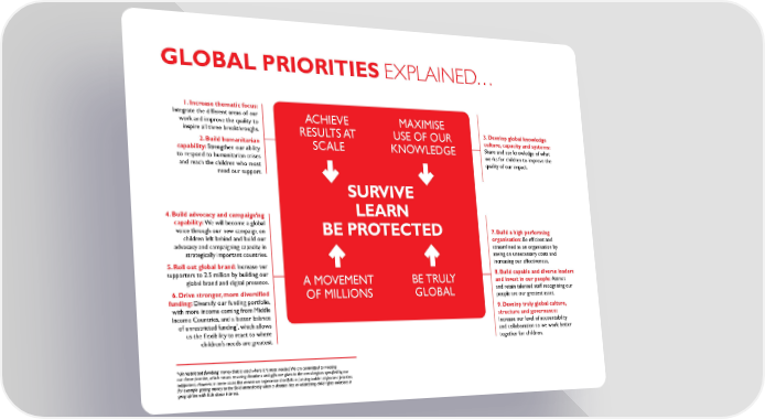 glOBAl PrIOrITIES explAined… 1. Increase thematic focus: Integrate the different areas of our AChIeve MAXIMISe work and improve the quality to inspire all three breakthroughs. reSUlTS AT USe Of OUr 3. develop global knowledge 2. Build humanitarian culture, capacity and systems: capability: Strengthen our ability SCAle KNOWleDGe Share and use knowledge of what to respond to humanitarian crises works for children to improve the and reach the children who most quality of our impact. need our support. SurVIVE 4. Build advocacy and campaigning lEArn capability: We will become a global voice through our new campaign on BE PrOTECTEd 7. Build a high performing children left behind and build our organisation: Be efficient and advocacy and campaigning capacity in streamlined as an organisation by strategically important countries. saving on unnecessary costs and 5. roll out global brand: Increase our increasing our effectiveness. supporters to 2.5 million by building our 8. Build capable and diverse leaders global brand and digital presence. A MOveMeNT be TrUlY and invest in our people: Attract 6. Drive stronger, more diversified Of MIllIONS GlObAl and retain talented staff recognising our funding: Diversify our funding portfolio, people are our greatest asset. with more income coming from Middle 9. develop truly global culture, Income Countries, and a better balance structure and governance: * Increase our level of accountability of unrestricted funding , which allows us the flexibility to react to where and collaboration so we work better children’s needs are greatest. together for children. *Unrestricted funding: money that is used where it is most needed. We are committed to meeting our donor promise, which means ensuring donations and gifts are given to the areas/regions specified by our supporters. However, in some cases this means we experience shortfalls in funding sudden important priorities, for example getting money to the field immediately when a disaster hits, or addressing child rights violations in geographies with little donor interest.