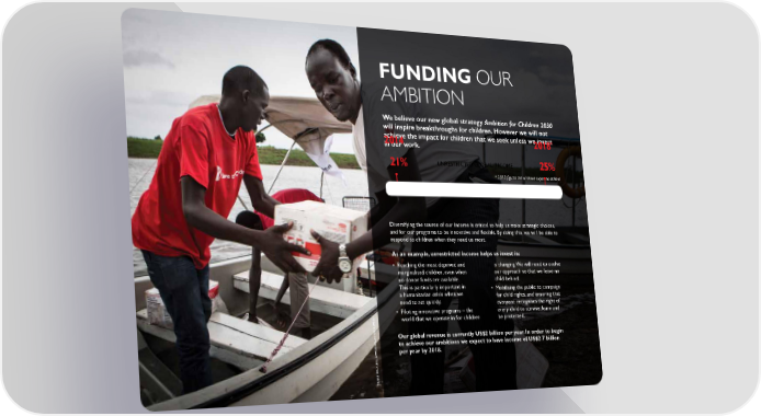 FundIng our Ambition We believe our new global strategy Ambition for Children 2030 will inspire breakthroughs for children. however we will not achieve the impact for children that we seek unless we invest * 2014 2018 in our work. 21% UNreSTrICTeD GlObAl INCOMe 25% * 2018 figures are what we expect to achieve Diversifying the source of our income is critical to help us make strategic choices, and for our programs to be innovative and flexible. By doing this, we will be able to respond to children when they need us most. As an example, unrestricted income helps us invest in: • Reaching the most deprived and is changing. We will need to evolve marginalised children, even when our approach so that we leave no no donor funds are available. child behind. This is particularly important in • Mobilising the public to campaign a humanitarian crisis when we for child rights, and ensuring that need to act quickly. everyone recognises the right of • Piloting innovative programs – the every child to survive, learn and J ONA world that we operate in for children be protected. T h AN hY Our global revenue is currently uS$2 billion per year. In order to begin AMS to achieve our ambitions we expect to have income of uS$2.7 billion /S A ve per year by 2018. T he Ch I l D re N