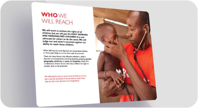 hA rr I e T WhO we lOGAN /S A ve will reACh T he Ch I l D re We will work to achieve the rights of all N MOST dEPrIVEd children, but we will put the And MArgInAlISEd ChIldrEn first and advocate for others to do the same. We will judge our and other’s successes against our ability to reach these children. We’re defining the most deprived and marginalised children as those least likely to survive, learn and be protected. There are many factors that influence whether a child is deprived and marginalised, including income, poverty, gender, geography, ethnicity or caste, and disability. Often, it’s a combination of these factors that deny children the right to survive, learn or be protected. We will only be able to ensure that all children survive, learn and are protected if we are able to reach those who are the most deprived and marginalised.