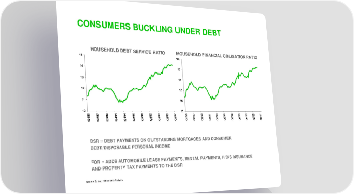 CONSUMERS BUCKLING UNDER DEBT HOUSEHOLD DEBT SERVICE RATIO HOUSEHOLD FINANCIAL OBLIGATION RATIO DSR = DEBT PAYMENTS ON OUTSTANDING MORTGAGES AND CONSUMER DEBT/DISPOSABLE PERSONAL INCOME FOR = ADDS AUTOMOBILE LEASE PAYMENTS, RENTAL PAYMENTS, H/O’S INSURANCE AND PROPERTY TAX PAYMENTS TO THE DSR Source: Bureau of Economic Analysis.
