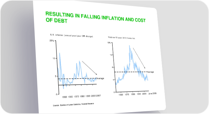 RESULTING IN FALLING INFLATION AND COST OF DEBT U.S. inflation (annual year/year CPI change) Yield on 10-year U.S. treasuries 25% 16% 12 15 8 Average 5 Average 4 -5 0 1950 1960 1970 1980 1990 20002007 1960 1970 1980 1990 2000 June2008 Source: Bureau of Labor Statistics, Federal Reserve